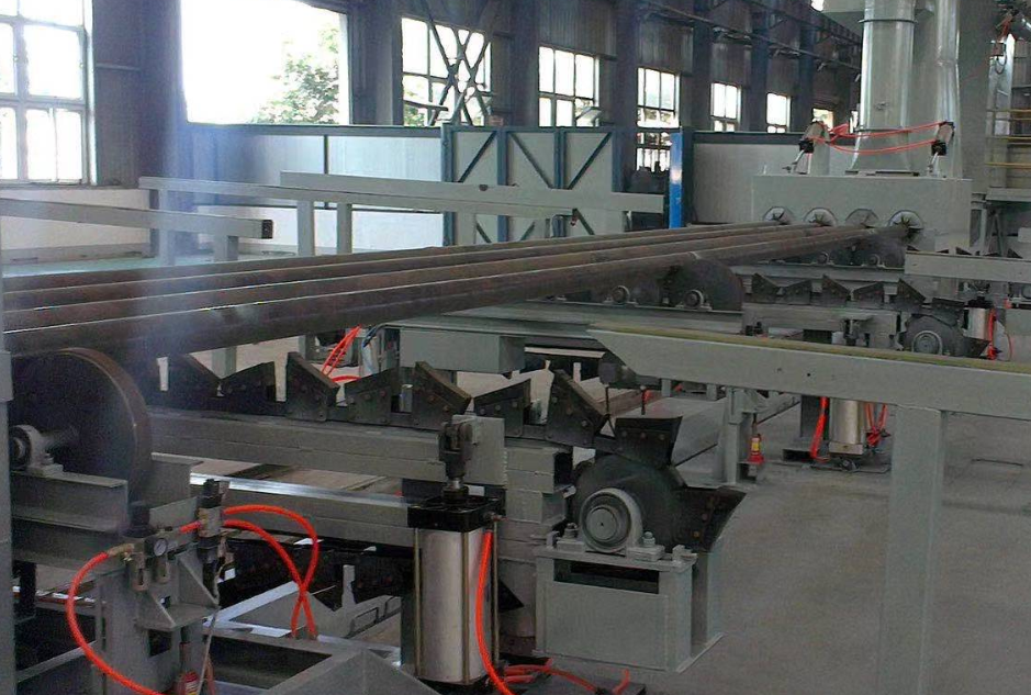 圓鋼、鋼管自動輸人清理室內拋射區時,邊前進邊旋轉的圓鋼、鋼管圓周外表連續不斷地接受縱向拋出高速彈丸流束的打擊與摩擦,使之氧化皮、銹層及異物迅速脫落,顯露出金屬本色。在清理室外,兩邊輥道裝卸工件。清理過程中,撒落下來的丸塵混合物經室體漏斗,縱橫螺旋輸送匯集于提升機下部,再提升到機器上部的分離器里,分離后的好彈丸落人料斗內供拋丸器循環使用;拋丸清理中產生的塵埃,由抽風管送向除塵系統,凈化后排入大氣中,顆粒狀塵埃被捕捉收集。