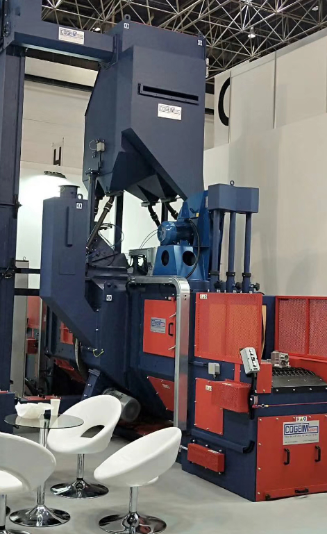 鋼托盤拋丸機主要是由清理室、室內輸送輥道與進出輸送輥道、拋丸器、彈丸循環系統 ( 含提升機、分離器、縱橫螺旋輸送器和供丸管道 ) 、吹掃機構、除塵、電氣控制等功能部件組成) 。