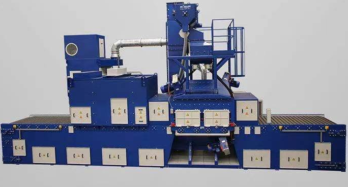 鋼板拋丸機是多數(shù)板材軋鋼廠必備的基礎設備,現(xiàn)在使用的都是輥道式鋼板拋丸機,它將不同厚度的一張張鋼板連續(xù)自動的進行表面潔凈處理,然后按照客戶要求進一步熱處理或防腐處理。鋼板拋丸機通過高速旋轉的拋頭葉輪將鋼丸以高速度拋投到鋼板表面,擊打磨削鋼板表面。拋頭分布在鋼板運輸輥道上下兩側,錯落放置。根據(jù)鋼板寬度的不同上下兩側的拋頭也不相同,同時調節(jié)鋼板在輥道上的傳輸速度和控制拋頭的鋼丸量,能對移動中的鋼板進行完美的拋丸處理。