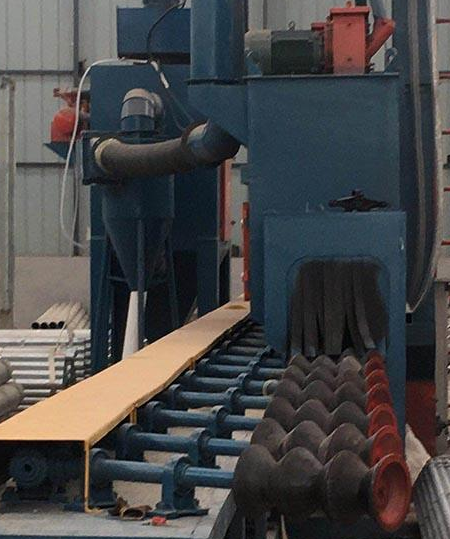 鋼管拋丸機主要由送進輥道、拋丸清理機、送出輥道、下料機構(gòu)、氣控系統(tǒng)、電控系統(tǒng)及除塵系統(tǒng)等組成。拋丸清理機由拋丸室、拋丸器總成、溜丸斗及格柵、丸渣分離器、提升機、平臺梯子欄桿、供丸系統(tǒng)等部件組成。