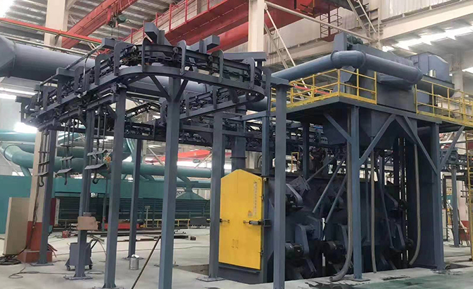 5、工件承載體采用龍門架結構,可保證工件在懸鏈吊掛下無障礙自由連續輸送,用戶可根據自己不同工件的要求隨意調整拋丸清理時間,以控制生產率與清理質量。工件可連續不斷的進行裝料、雙工位拋丸清理、卸料。