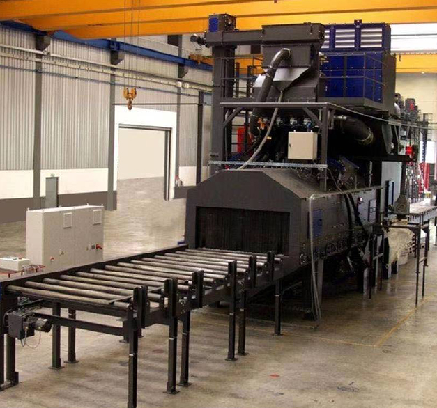 落入鋼材上面的彈丸與銹塵經吹掃裝置吹掃,撒落下來的丸塵混合物由回收螺旋輸送到室體漏斗、縱橫向螺旋輸送機匯集于提升機下部再提升到機器上部的分離器里,分離后的純凈彈丸落入分離器料斗中內,供拋丸循環使用。通過式拋丸機拋丸清理中產生塵埃,由抽風管送向除塵系統,凈化處理后的凈氣排放到大氣中,顆粒狀塵埃被捕捉收集通過式拋丸機主要用于建筑、橋梁等行業用大型工字型鋼、等較高的鋼結構件消除應力及表面除銹清理。