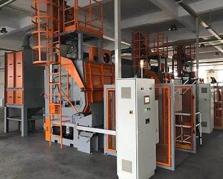 健身器材通過式拋丸機在清理過程中由電氣控制的可調速輸送輥道將健身器材或鋼材送進清理機室體內拋射通過式拋丸機區,通過式拋丸機其周身各面受到來自不同坐標方位的強力密集彈丸打擊與磨擦,使之其上的氧化皮、銹層及其污物迅速脫落,健身器材表面就獲得一定粗糙度的光潔表面,在清理室外兩邊進出口輥道裝卸工件。