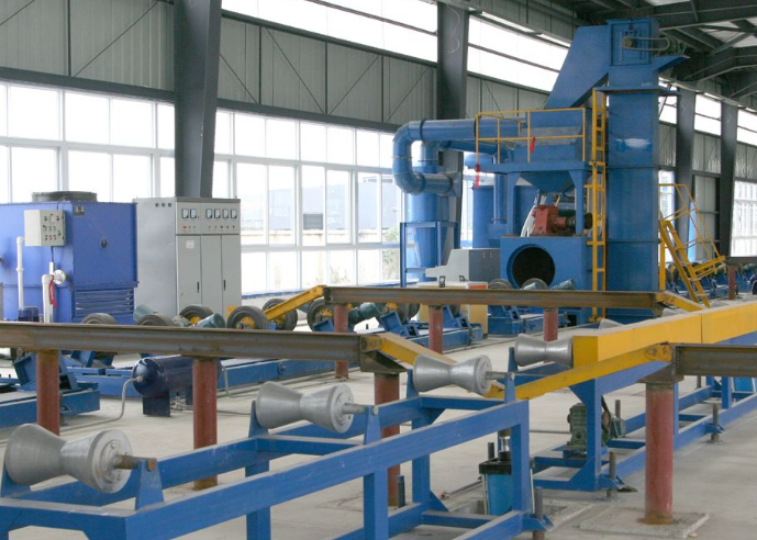 鋼管拋丸機由送進輥道、拋丸清理機、送出輥道、下料機構、氣控系統(tǒng)、電控系統(tǒng)及除塵系統(tǒng)等組成。拋丸清理機由拋丸室、拋丸器總成、溜丸斗及格柵、丸渣分離器、提升機、平臺梯子欄桿、供丸系統(tǒng)等部件組成。
